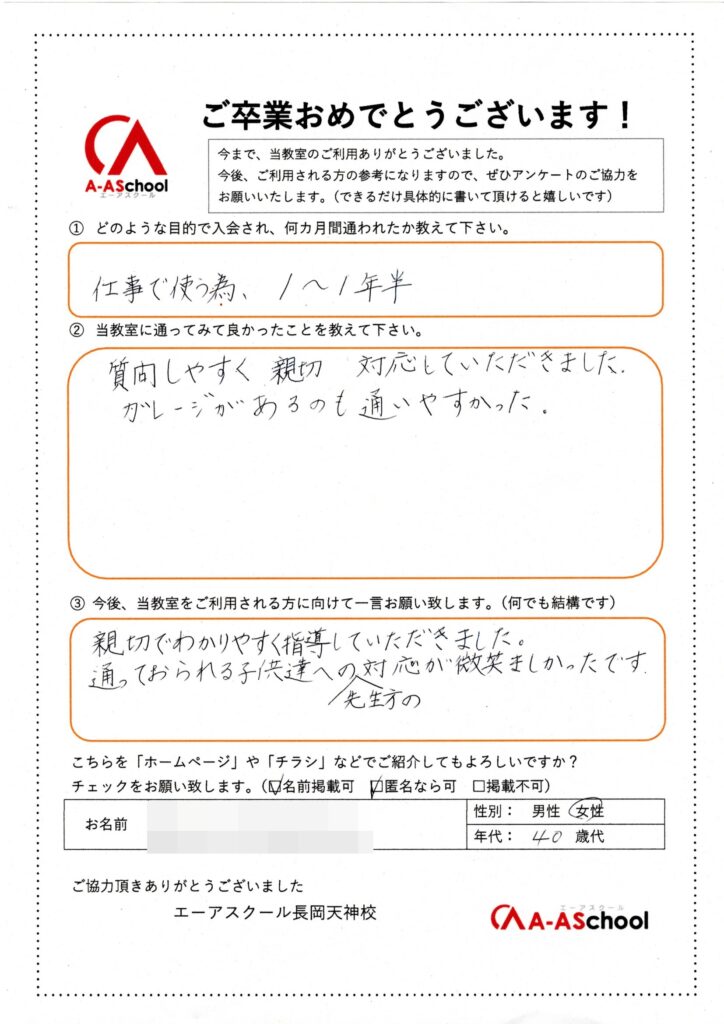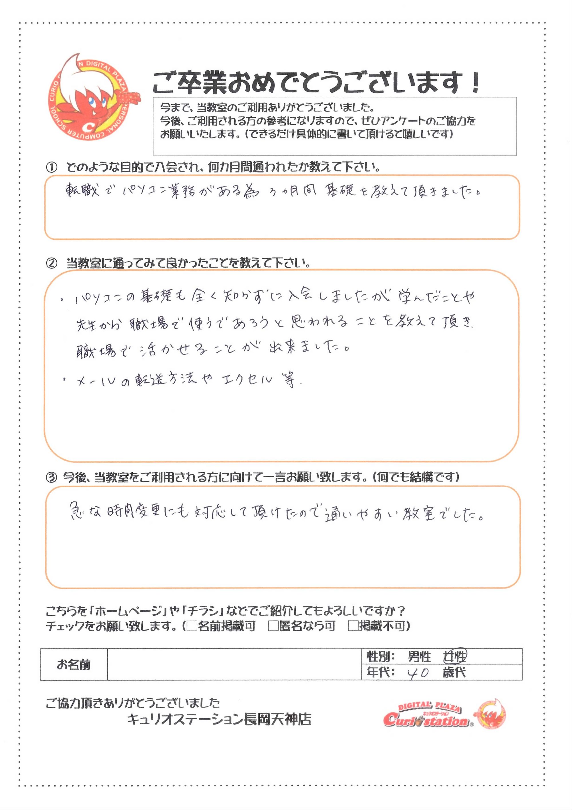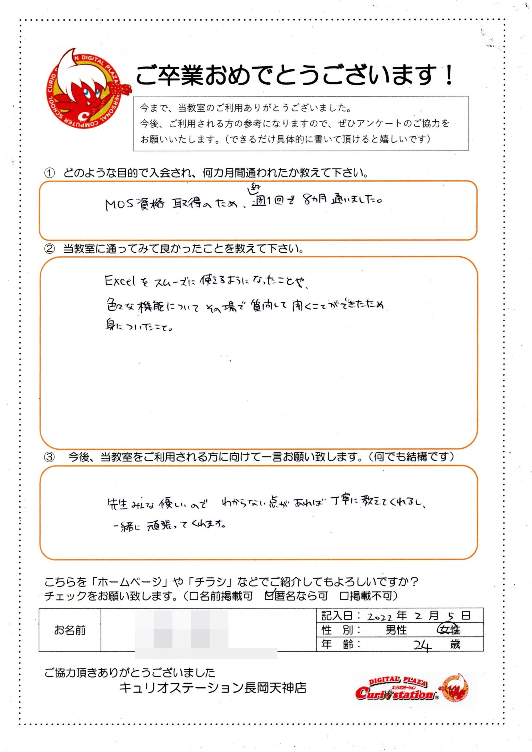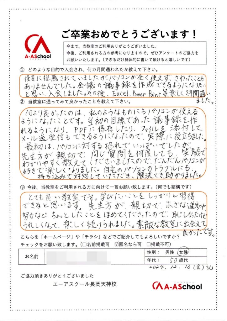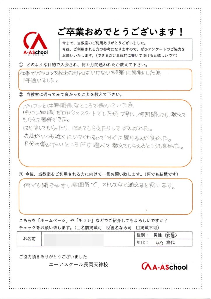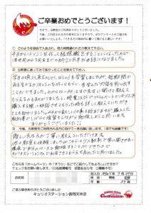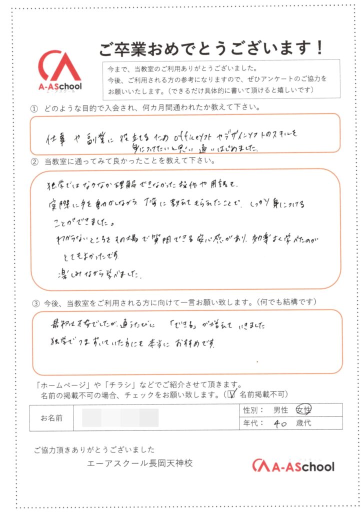 仕事でも、不安だったパソオンでの仕事も教えて頂いたことがたくさん役に立ち、あまり時間を使わず処理することができています。時間の変更などもたくさん聞いていただき、自分のペースで通うことができました。パソコン初心者の私でも資格を取ることができ、仕事にも役立ててます。とてもやさしく教えて頂けて、アットホームな教室なので、ぜひオススメです。