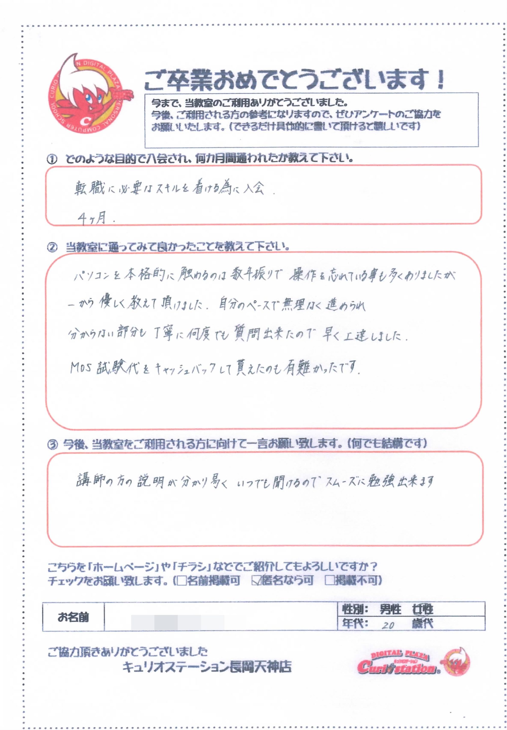 パソコンとは無関係なところで働いていた為、パソコン知識ゼロからのスタートでしたが、丁寧に何回聞いても教えてもらえて習得できた。