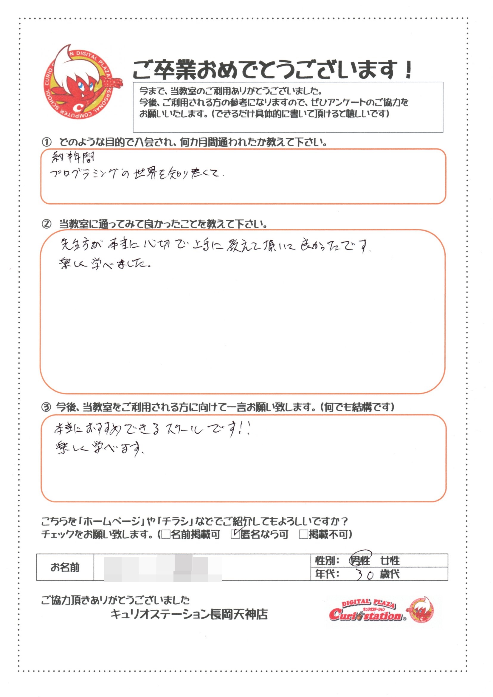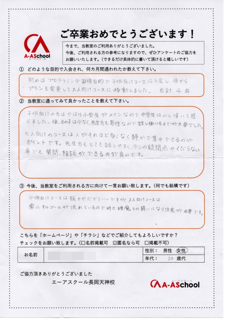 【20代女性】初めはプログラミング習得目的で子供向けコースから大人向けコ移動して4年受講