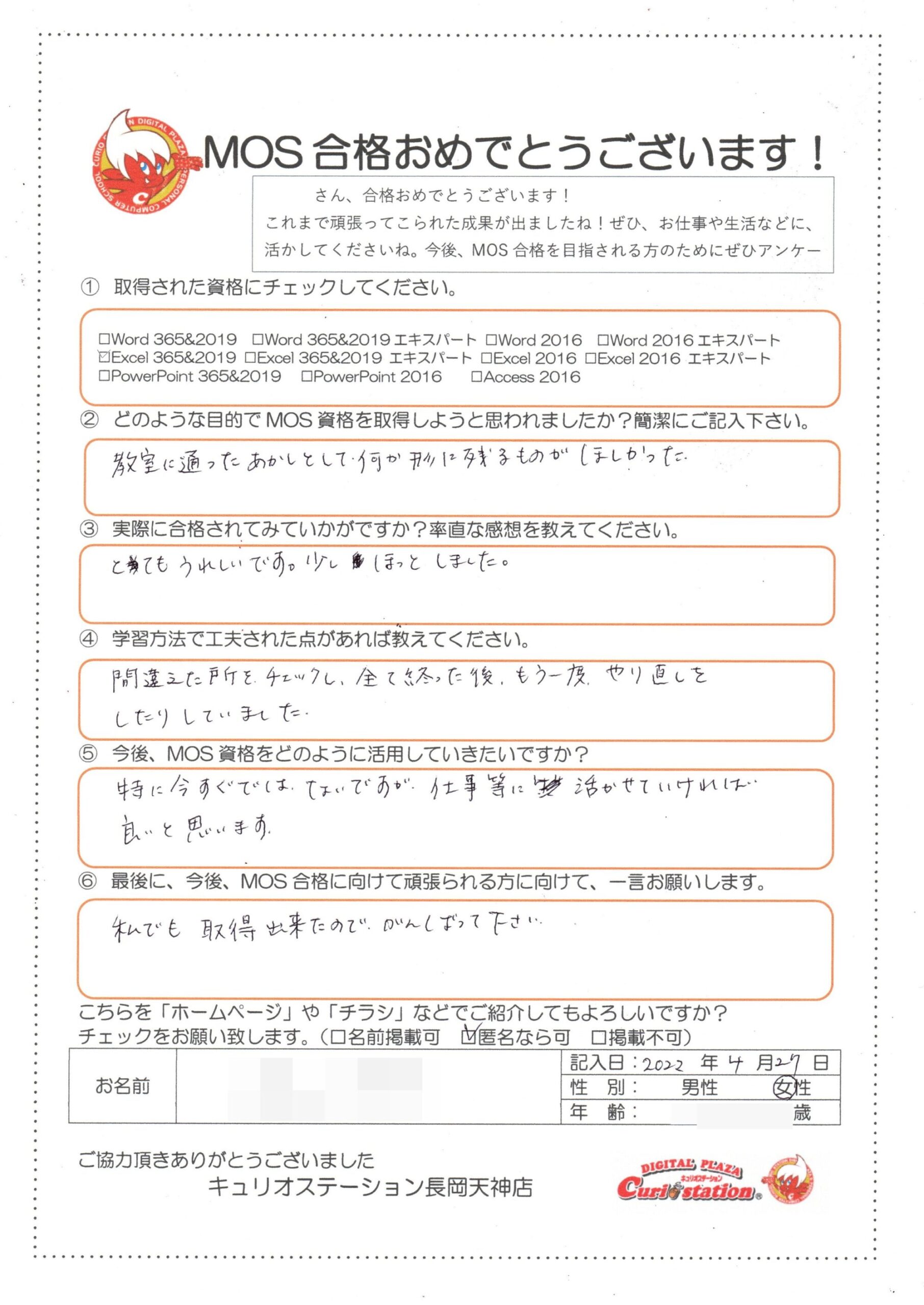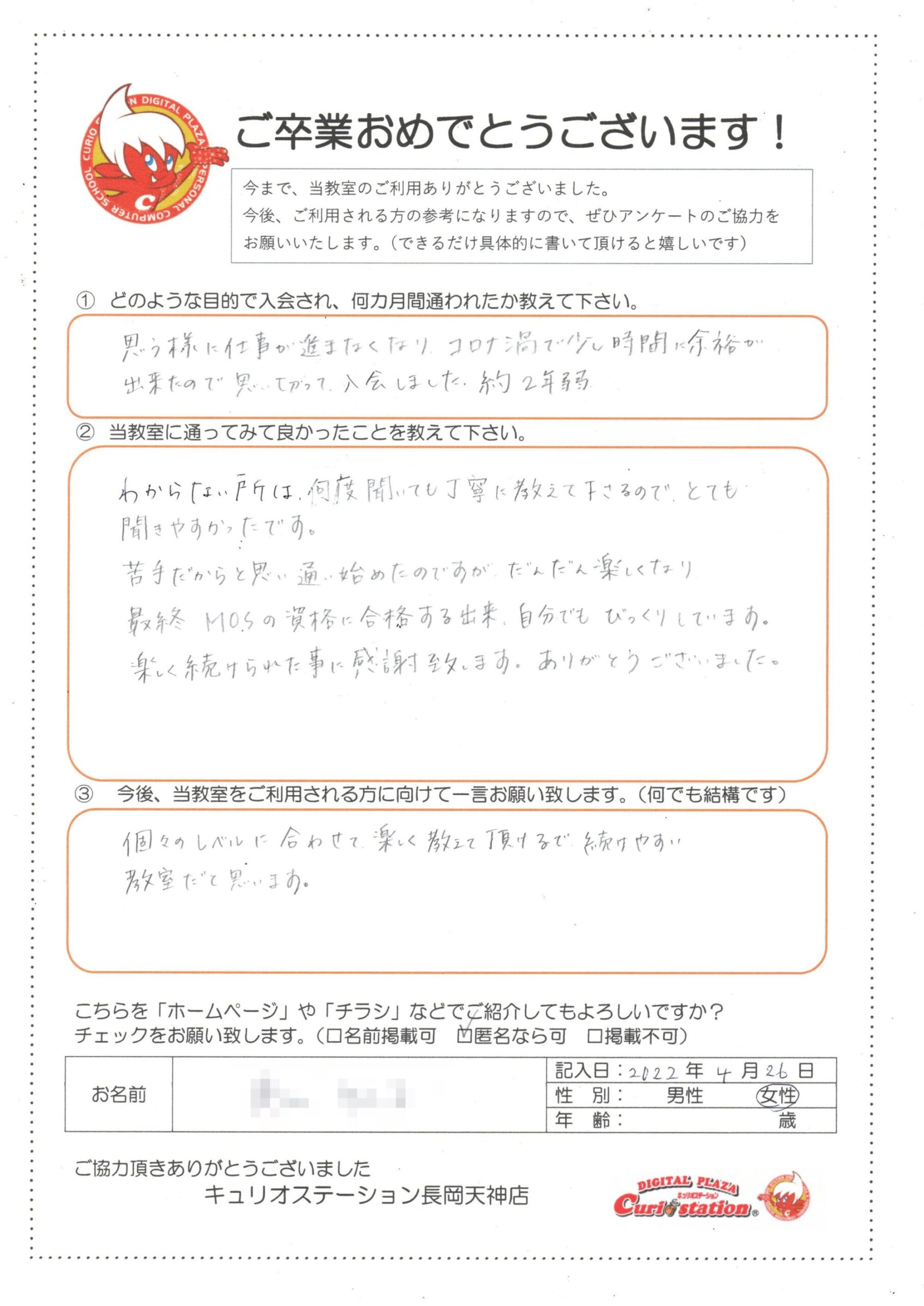 【20代女性】 MOS対策コース(Excelスペシャリスト合格)1年