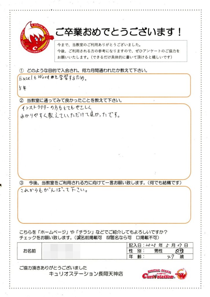 パソコンにはくわしいですが、エクセルやワードも少しつかったことはありましたが、深くまでやったことはなかったので、教室に通ったことでいろいろ知ることができたので良かったと思います。