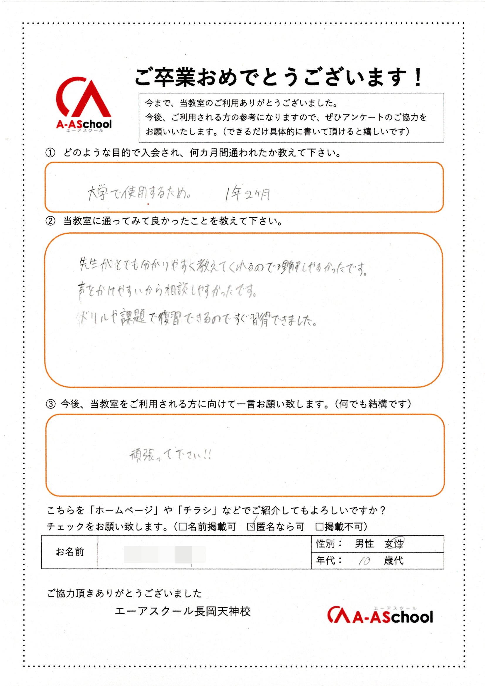 いろんなことができるようになりました。少人数で先生方もやさしく、わかりやすく教えていただけます。