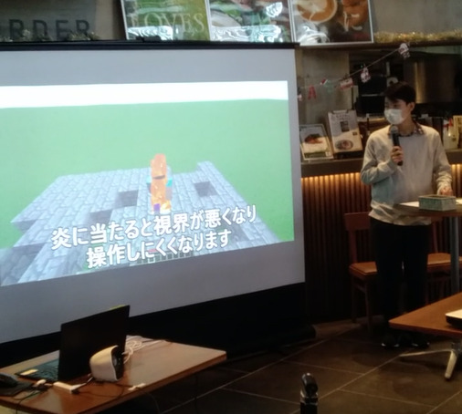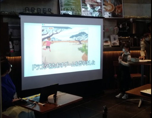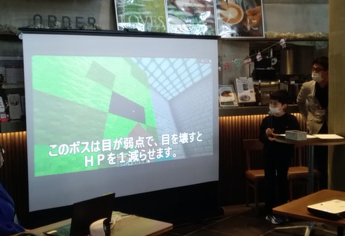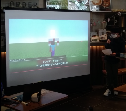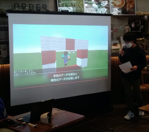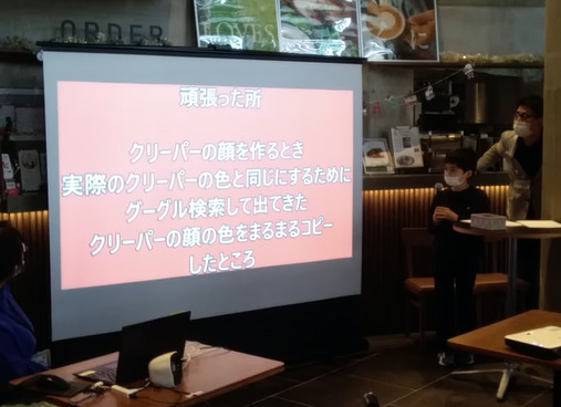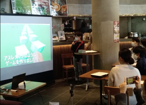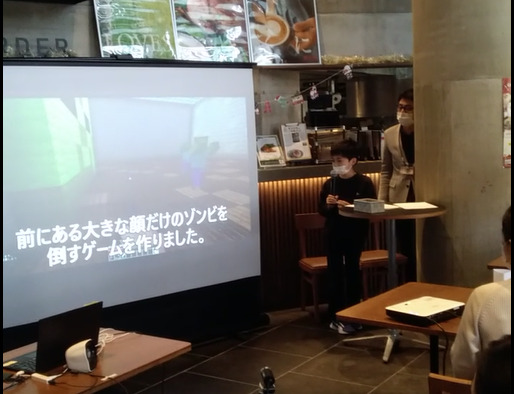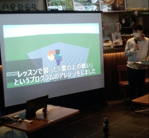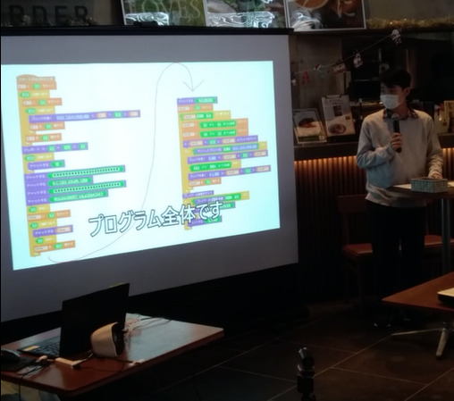 日頃のプログラミング学習の成果の発表の場として、生徒たちには、約2分のPR動画を作成してもらい、会場のプロジェクターを使って自分の言葉で発表してもらいました。→ 発表動画はこちら