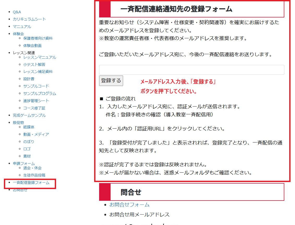 管理者様ご自身で「一斉配信メールの通知先アドレス」を登録できる専用フォームを、
