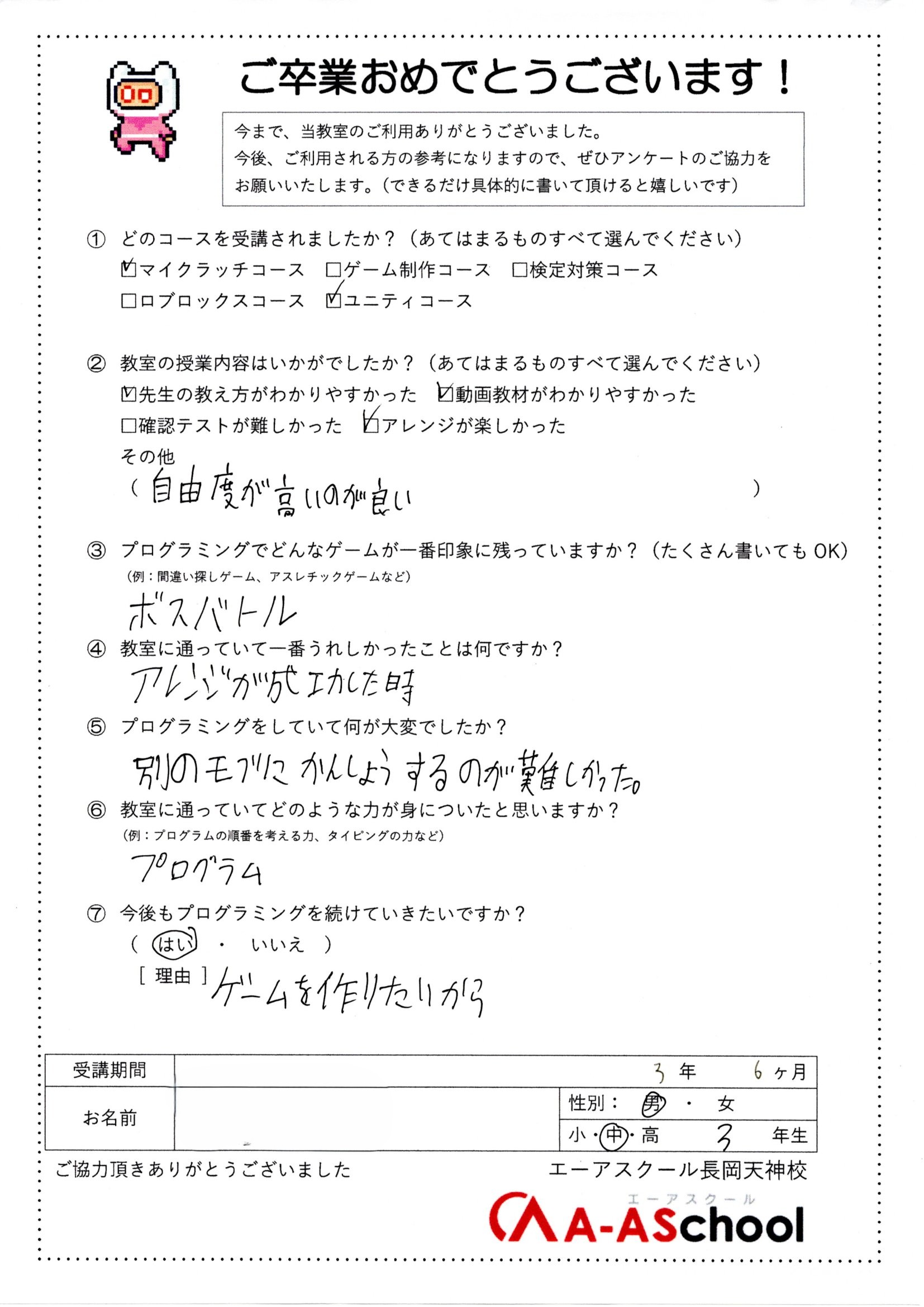 3年半プログラミングを頑張ってくれた、中3のA君が先日卒業されました。