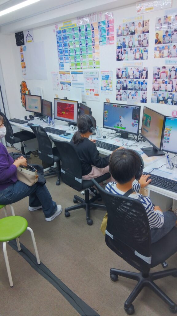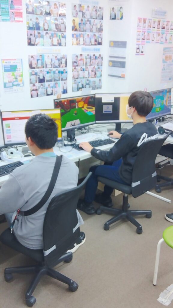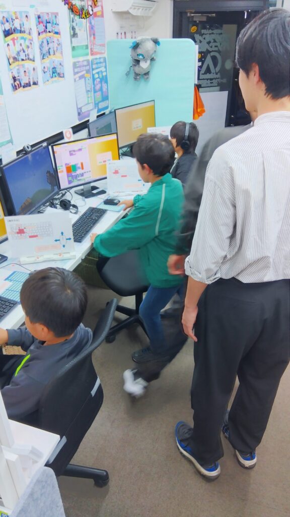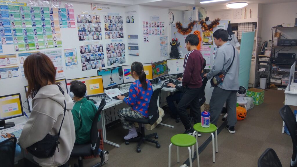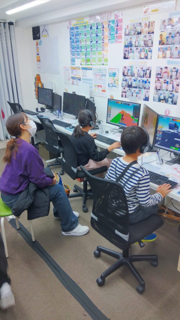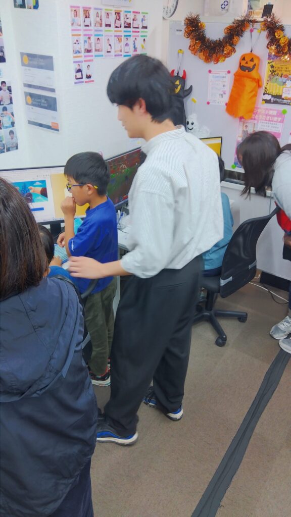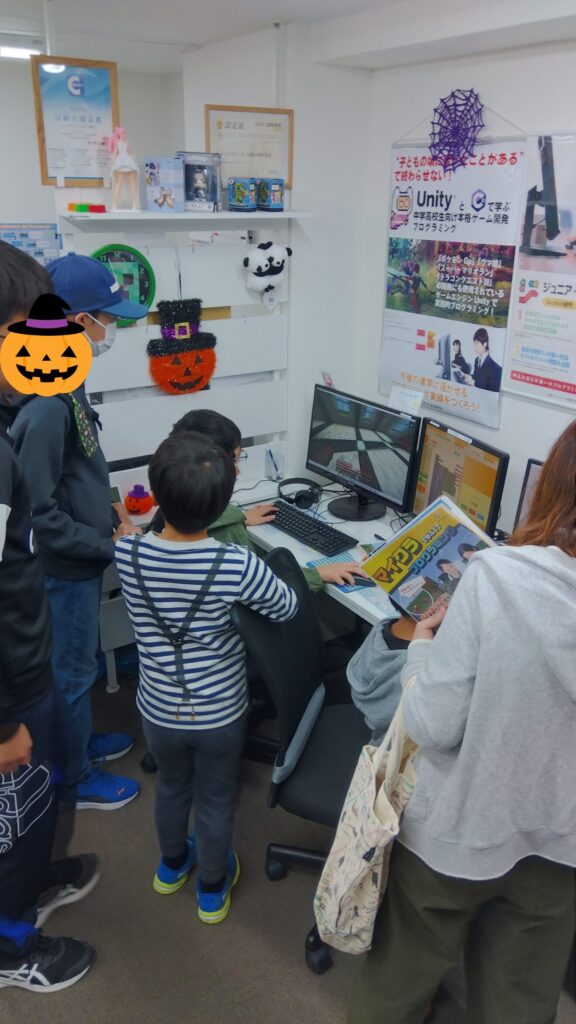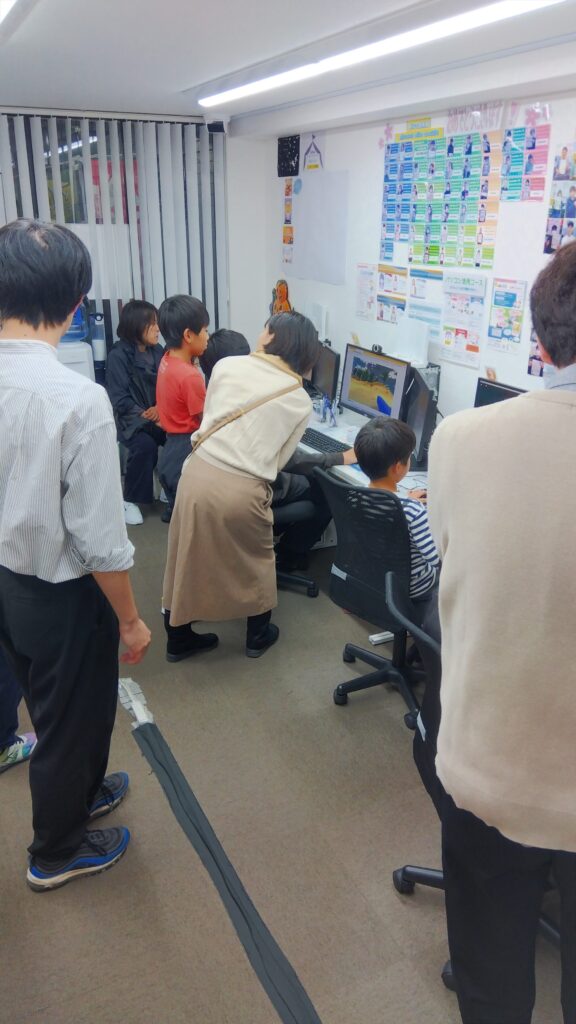 生徒さんが、普段レッスンで作っているスクラッチを使ったゲームや、プログラミングコンテストで入賞した当校の生徒さんの作品、そして、マイクラや人気急上昇中のロブロックス、本格ゲーム開発ができるUnity(ユニティ)で作ったシューティングゲーム・ブロック崩しゲームなどプレイしてもらいました。