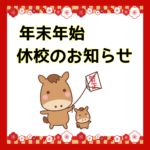 2025年12月5日 / 最終更新日 : 2025年12月5日 widetree 年末年始休校のお知らせ 年末年始のお休みは12/29(月)~1/5(月)とさせていただきます。教室が開くのは1/6(火)からとなりますので、日程の調整等もよろしくお願いします。 今年もありがとうございました。では皆様、良い年末年始をお過ごしくだ […]